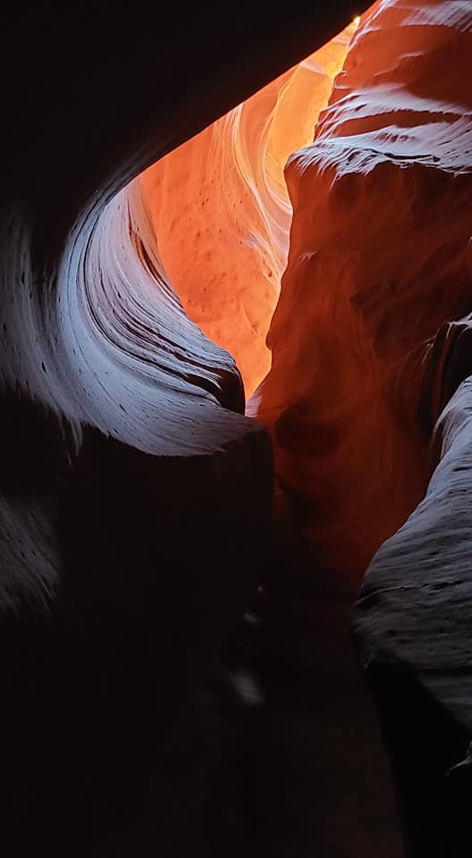 Slot canyons are found worldwide, in geographical areas with little rainfall. Here in the US, the ones we know of are in northern Arizona, southern Utah, New Mexico, and California. A slot canyon is vaguely defined as a long, narrow, deep and tortuous channel or drainageway with walls of sandstone, limestone and other sedimentary rocks. I was reading up on the Antelope canyons and admiring the photos on the website of the local tour company way before our trip but I later realized nothing could have adequately prepared me for the experience. What I saw exceeded my expectations. From the beams of sunlight that find their way through the narrow slits above me, creating natural hues of orange, red, yellow, pink and purple; to the variable and sometimes undulating shapes of the sandstone walls, which, at certain points are literally next to you – everything exudes our Creator’s majesty. It is incredibly beautiful, fascinating, and almost otherworldly. I noticed though that because of the irregularly-shaped spaces inside, there are segments and crevices that remain in darkness. They are either too distant from the openings where sunlight penetrates the canyon, or they are positioned at an angle that creates shadows and prevents them from being illumined. However, when flash floods occur as they do during the monsoon season, water can rapidly fill every inch of the canyon. There is no corner, crevice, slit, hole, that cannot be reached and washed with the gush of rainwater.